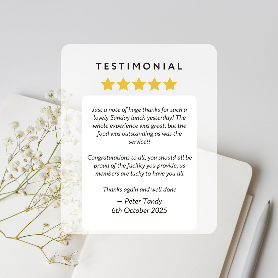 We would just like to pass our thanks to you and the team for a magnificent lunch yesterday. It was really lovely and please pass on our thanks to the young lady who attended our table, she looked after us splendidly and is a credit to the catering team.